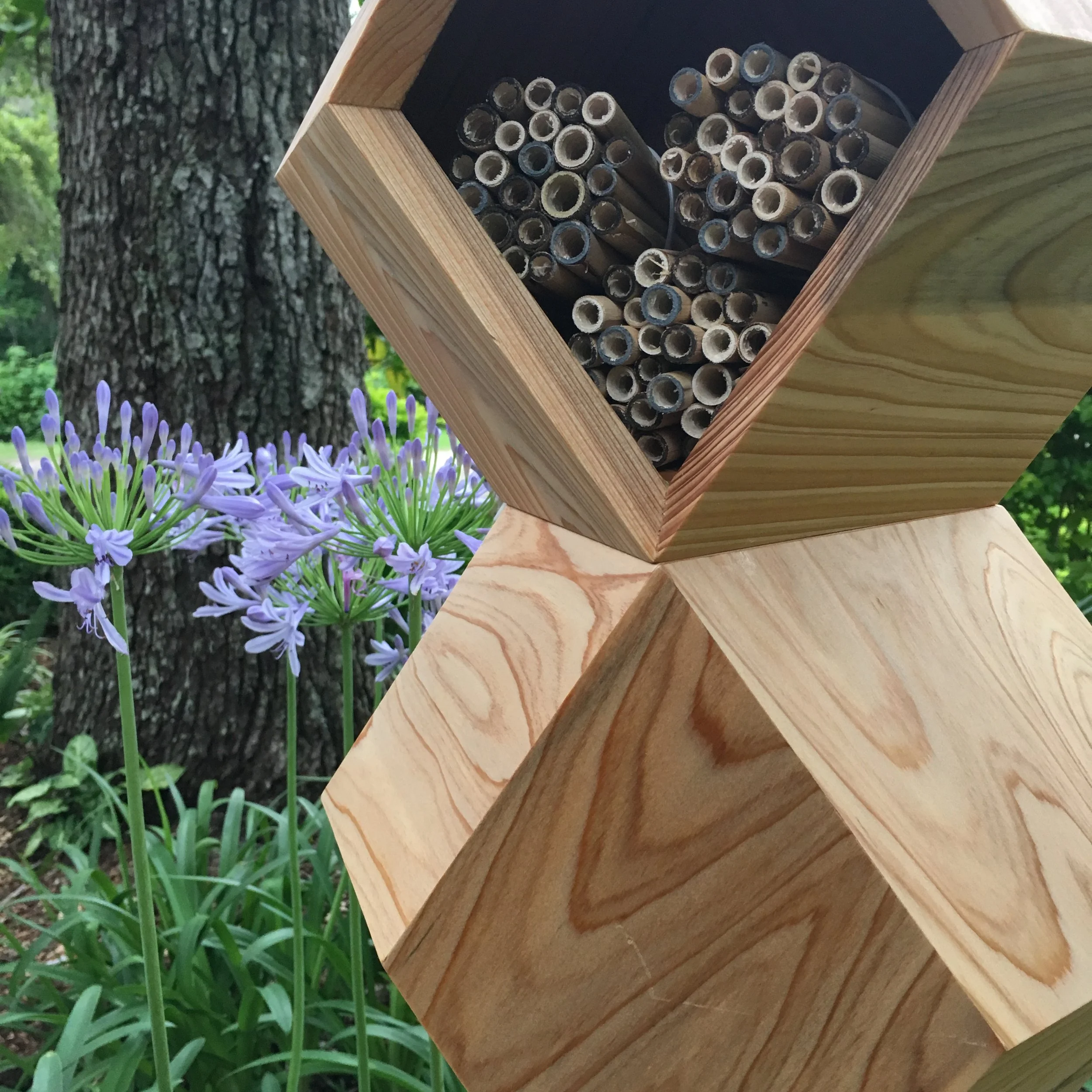 Bee Manor is a site-specific, multi-media artwork commissioned for the Grow Pavilion and Gallery at the Saint Louis Science Center. Bee Manor functions both as a sculpture and as a native bee nesting site for tunnel-dwelling insects. The form is influenced by insect architecture, consisting of three stacked rhombic-dodecahedrons. The sculptures are filled with hollow reeds and bamboo to provide nesting materials for native bees and solitary wasps. (The images show the artwork in process before being shipped off for installation.)