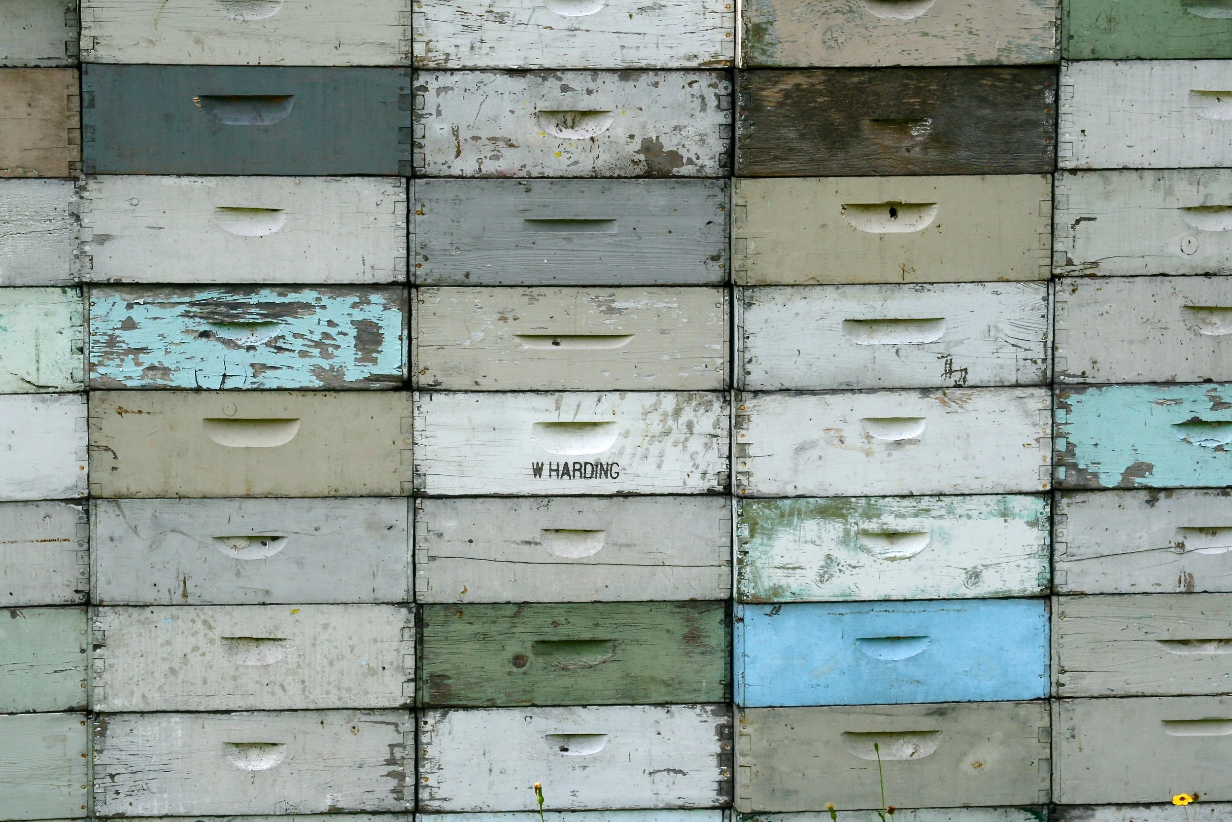 Archival inkjet print, Untitled, Empty, stacked beehive boxes behind bee supply store in Florida (2008)